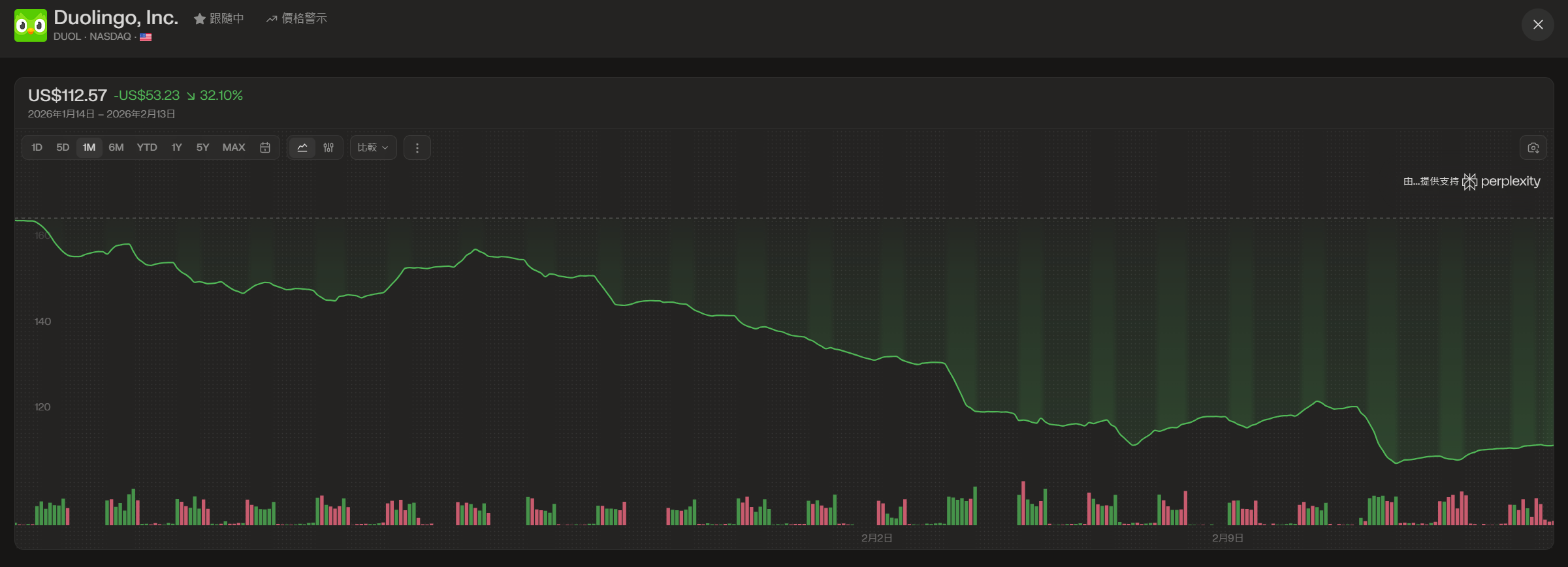 Duol 在1月至2月時間,我分批慢慢建倉,加上少量期權操作,目前是我的第二大倉位。平均成本為$131。由於引伸波幅大的關係。Duol的期權金十分不錯。