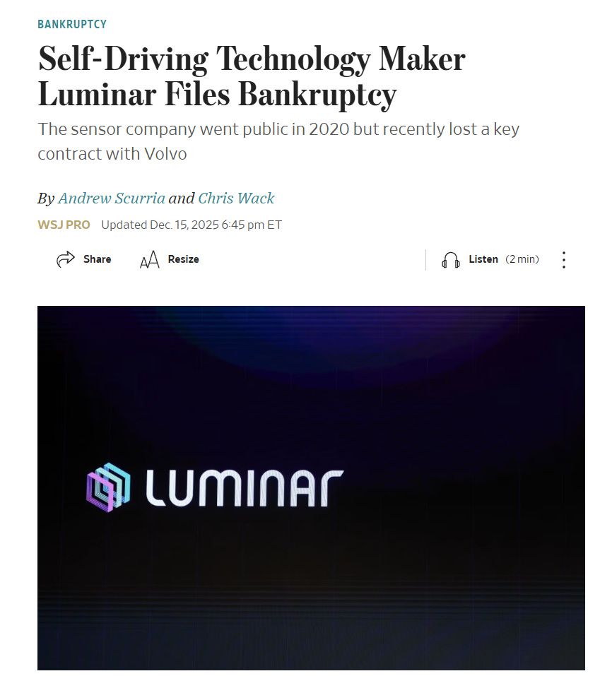 2025 年 12 月 15 日,曾經被視為自動駕駛傳感器領域的明日之星、在 SPAC熱潮中估值一度突破 120 億美元的 Luminar Technologies ($LAZR),正式向美國德克薩斯州南區破產法院申請第 11 章破產保護 。這家總部位於奧蘭多的企業最終在商業運作上的徹底崩潰,更象徵著西方激光雷達(LiDAR)產業在與中國供應商的成本戰、技術路線之爭以及汽車製造商需求轉向的博弈中,遭遇了毀滅性的挫敗。