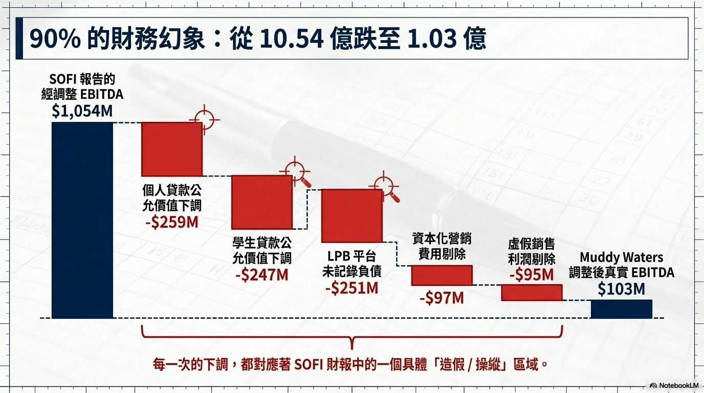 只要 SoFi 使用的合法會計準則能讓利潤變好看,渾水就全部把它扣掉,換成最極端、最悲觀的算法。渾水算出來的那個「1.03 億美元」真實 EBITDA,根本不是客觀事實,而是渾水為了配合自己「做空部位」所量身打造的數字。 如果一家正規銀行的財報可以這樣隨便被一家做空機構重新定義,那全美國的銀行都可以被說成是詐騙集團了。