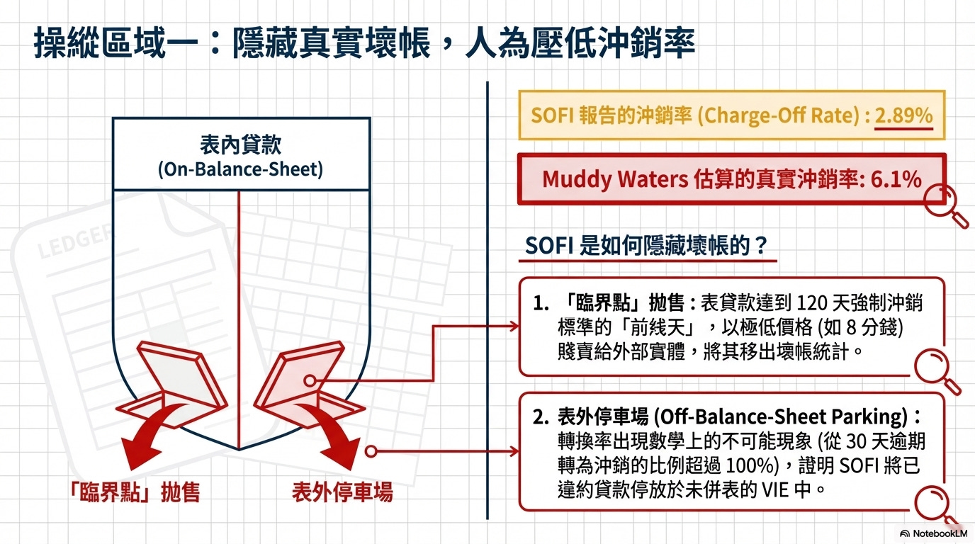 美國銀行法規規定,個人貸款如果 120 天都沒人還錢,就必須強制認列為「壞帳」。渾水指控 SoFi 為了不讓這個壞帳數字變難看,故意在第 115 天或 119 天,把這筆爛帳以「跳樓大拍賣」的價格(比如 1 塊錢只賣 8 分錢)賣給外面的討債公司。這樣一來,這筆錢就不算在「壞帳率」裡面了。