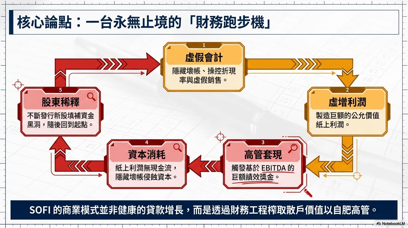 他們把SoFi整個生意畫成一台永遠跑不完的健身跑步機:你越跑越快(高管賺錢),但其實原地踏步,股東的錢一直被消耗,最後又要發新股補洞……循環回去。