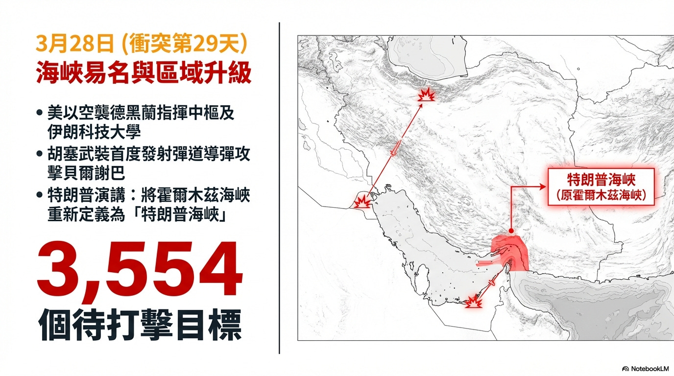 外交與政治表態:美國開始在幕後進行外交談判的嘗試。同時,特朗普演講稱霍爾木茲海峽為「特朗普海峽」,並表示伊朗仍有約3,554個待打擊目標。泰國則宣布與伊朗達成協議,其油輪可安全通過海峽。