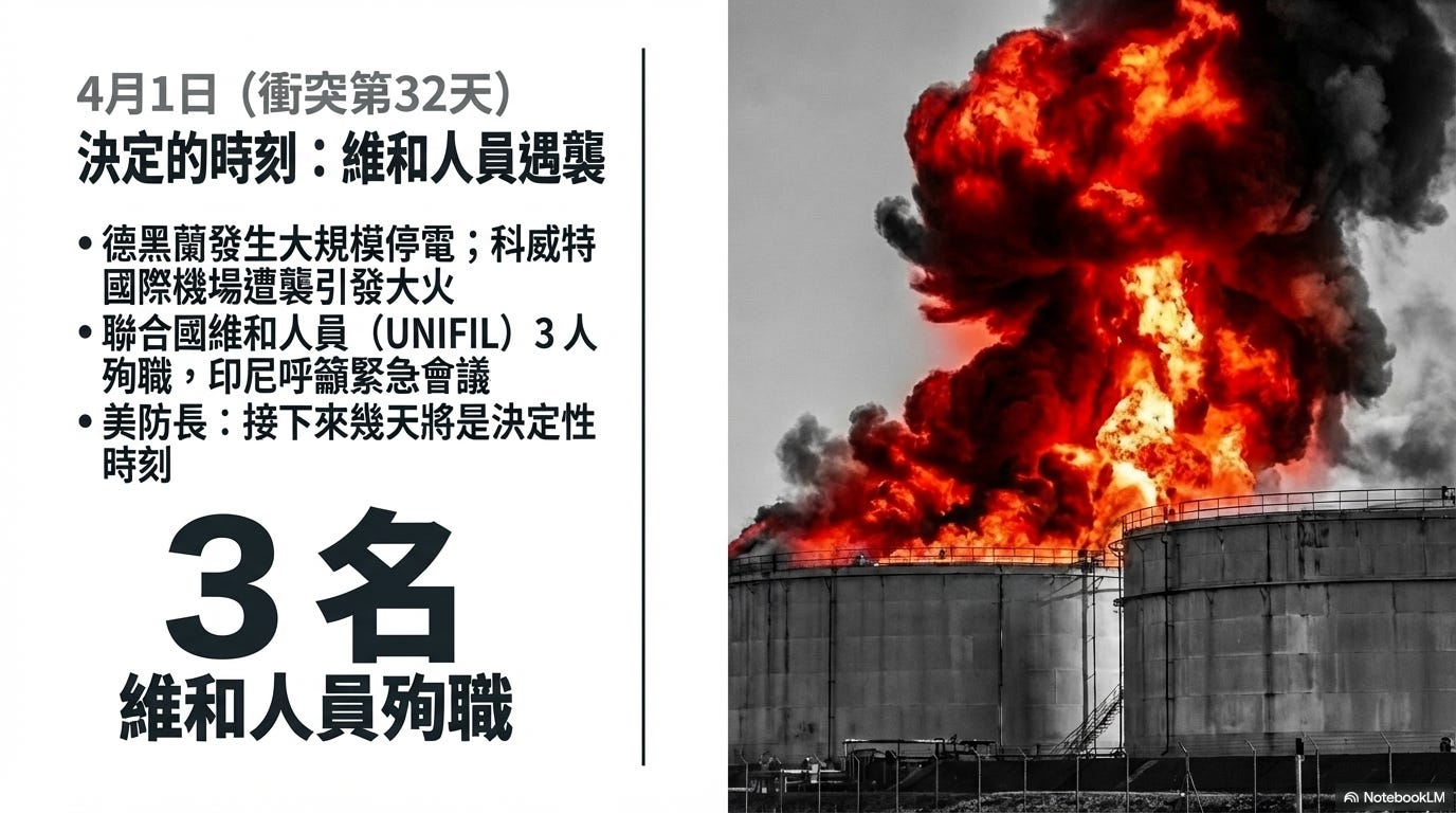 軍事衝突與傷亡:德黑蘭傳出爆炸與停電,伊斯法罕軍事設施遭襲。以色列證實4名士兵在南黎巴嫩陣亡。聯合國駐黎巴嫩臨時部隊有3名維和人員遇襲身亡,促使印尼呼籲召開安理會緊急會議。