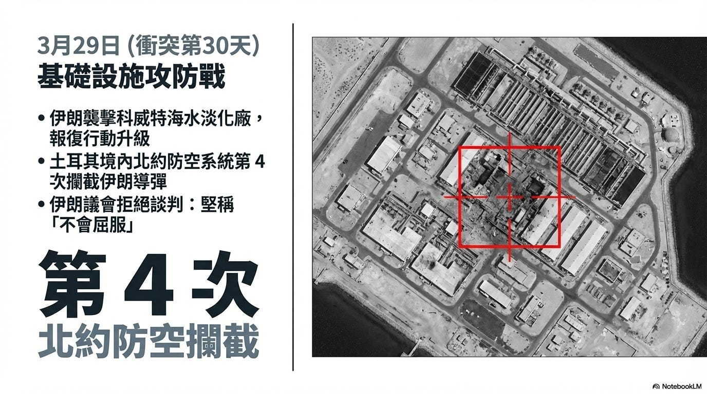 伊朗擴大報復行動:伊朗襲擊科威特海水淡化廠及軍事設施,導致死傷,標誌著對海灣國家基礎設施打擊升級。伊朗亦持續攻擊阿聯酋與巴林鋁廠,並向以色列Beersheba地區發射7波導彈報復,造成11人受傷及化學廠起火。此外,伊朗無人機也攻擊了伊拉克。