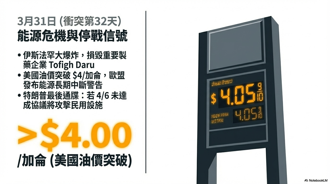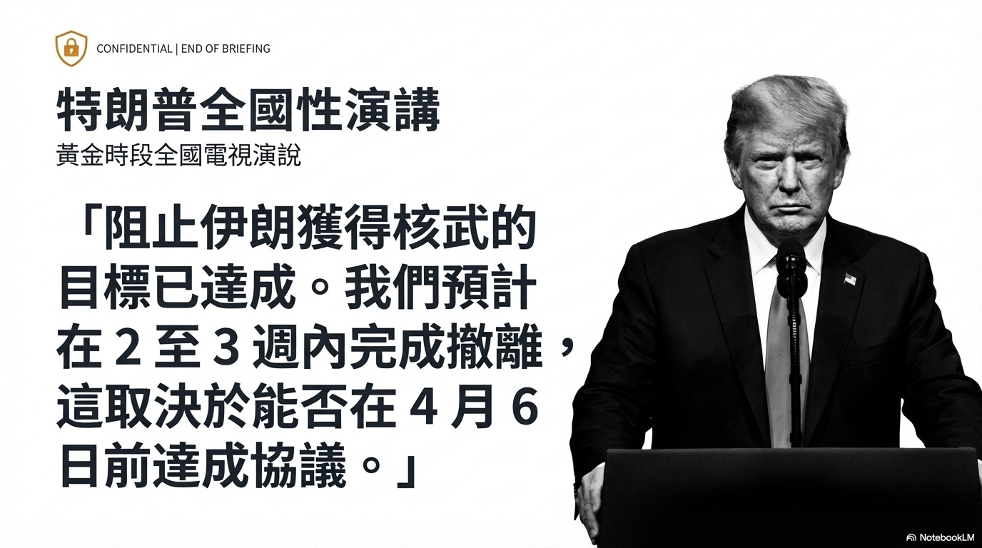 美國釋放停戰信號與通牒:特朗普威脅若4月6日前未達協議,將打擊伊朗民用基礎設施。但他同時在白宮表示,阻止伊朗獲得核武的目標已達成,預計美軍將在2至3週內停止攻擊並撤離。