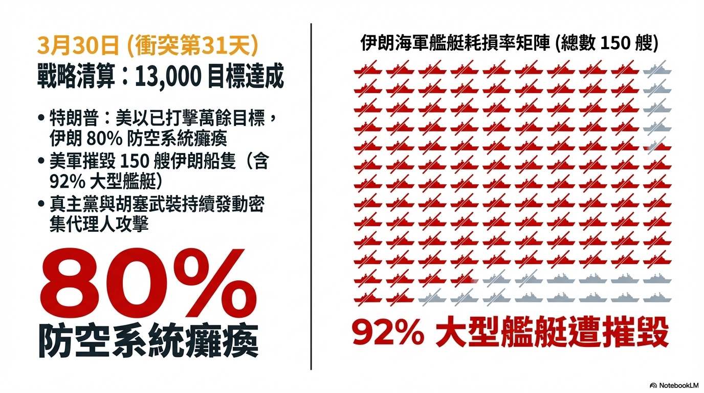 美以聯軍戰果宣稱:特朗普受訪表示已打擊13,000個目標,尚餘約3,000個待清除。以軍宣稱已摧毀伊朗80%以上防空系統。白宮發言人表示美軍已摧毀150艘伊朗船隻,包含92%的大型艦艇。
