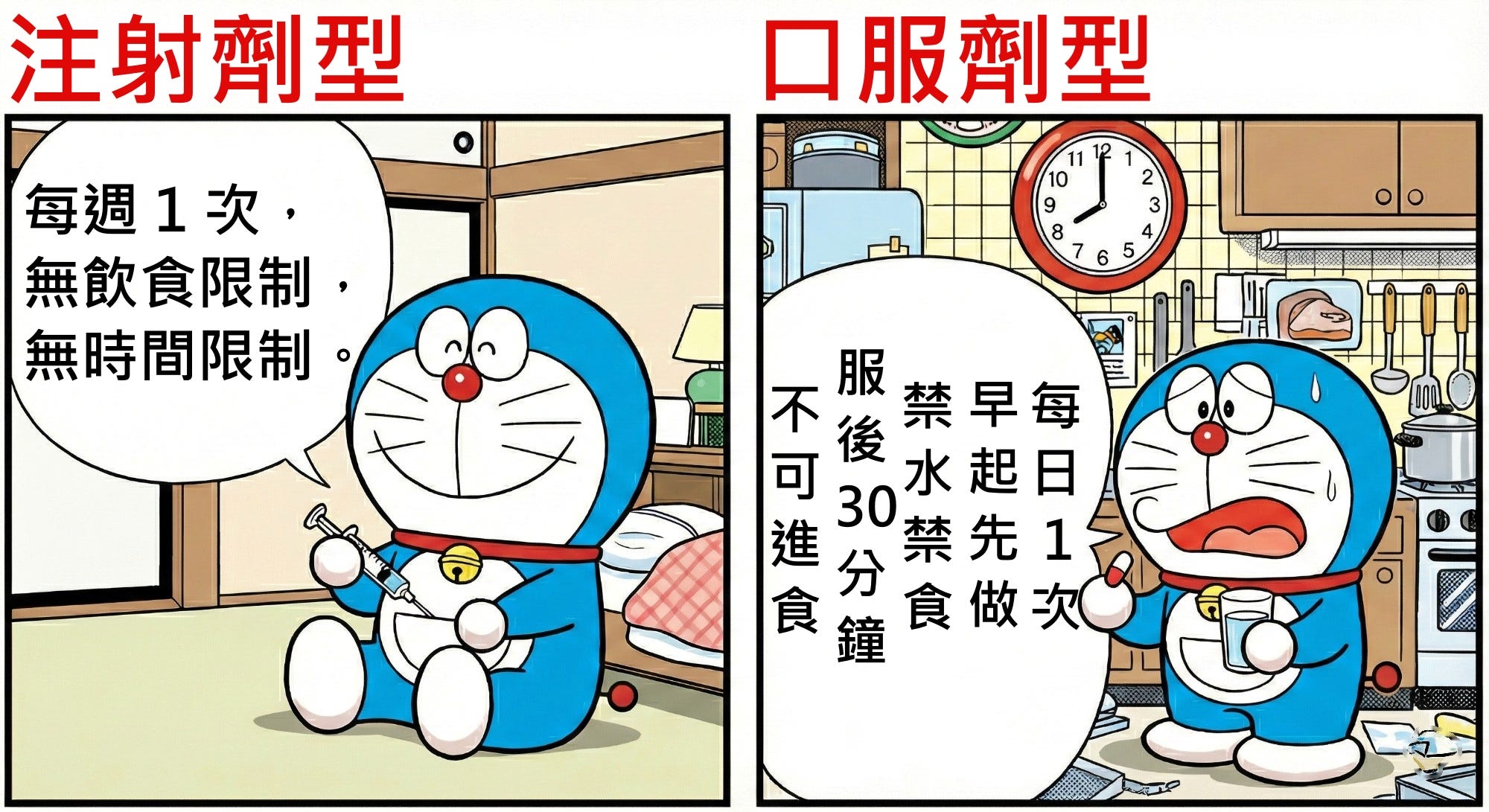 口服劑型:每日 1 次 + 嚴格禁食禁水 + 必須在早晨第一件事做 + 服後 30分鐘不可進食。